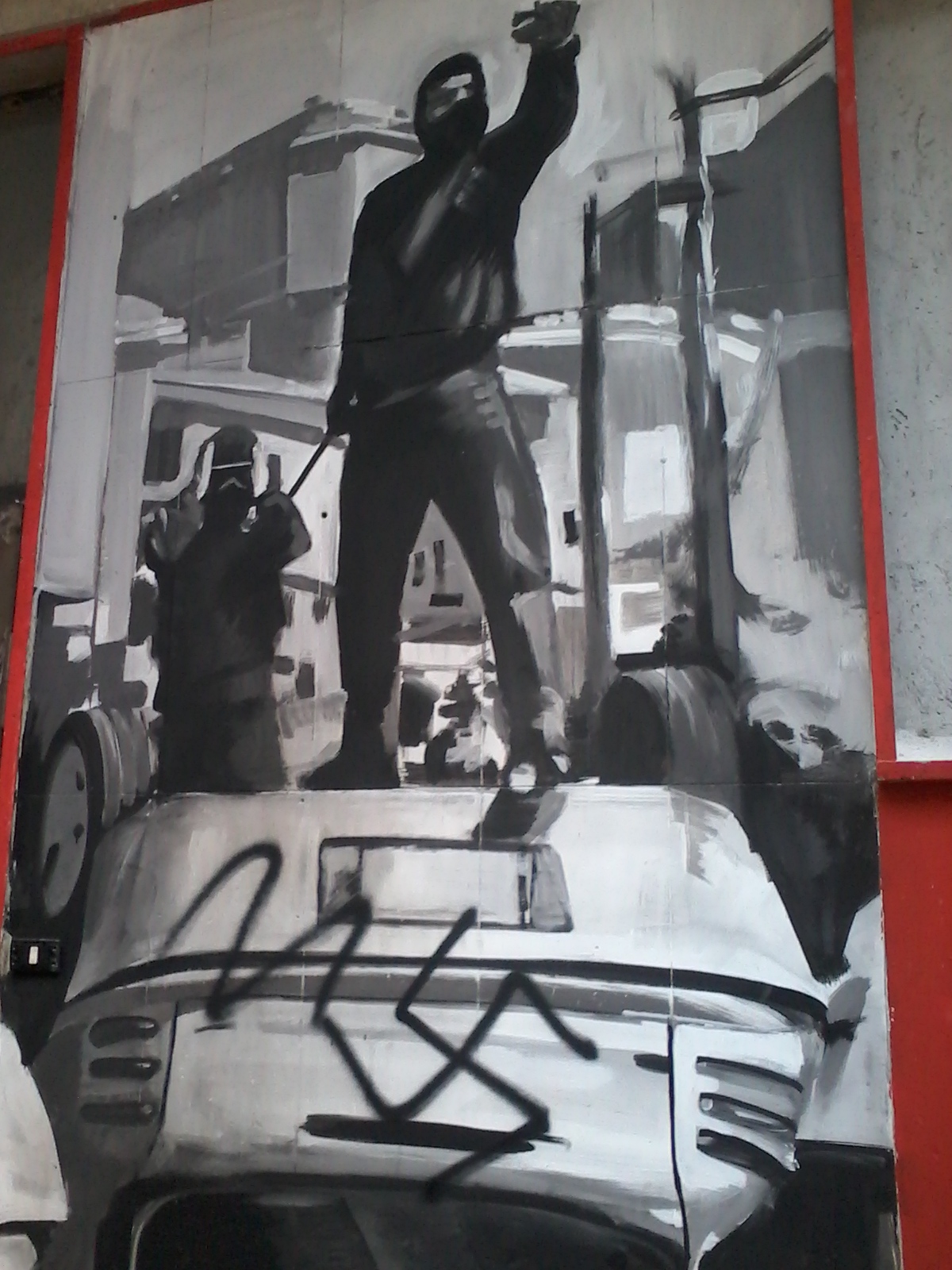 Svastiche sull’hotel Piemonte: l’immagine è di questa mattina in Via Ruggiero Settimo (zona Piazza Piemonte). La palazzina, già sede di un albergo, era stata occupata illegalmente lo scorso anno da gruppi anarchici, che ne avevano fatto un centro sociale. Il gruppo anarchico aveva dipinto sulle pareti gigantografie con immagini di rivolta armata che avevano fatto molto discutere. La palazzina era stata sgomberata in Agosto, dopo che le indagini sui disordini del 1 maggio a Milano avevano individuato nell’ex albergo uno dei covi dei black-block coinvolti. Ora lo sfregio nazi: due svastiche e tre fasci tracciati a vernice nera sui murales anarchici. I murales non sono mai stati cancellati malgrado il contenuto eversivo, e ora le svastiche rischiano di gettare benzina sul fuoco non sopito degli opposti clan di estrema destra e sinistra.